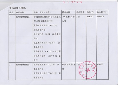又是泰維??!——中標(biāo)國(guó)家級(jí)專業(yè)檢驗(yàn)機(jī)構(gòu)政府采購(gòu)項(xiàng)目!項(xiàng)目名稱:湖北省醫(yī)療器械質(zhì)量監(jiān)督檢驗(yàn)研究院專用設(shè)備購(gòu)置項(xiàng)目06包項(xiàng)目包名稱:切片機(jī)、染色機(jī)等。項(xiàng)目編號(hào):WHCSIMC2019-2607152ZF(H)湖北省醫(yī)療器械質(zhì)量監(jiān)督檢驗(yàn)研究院是經(jīng)國(guó)家食品藥品監(jiān)督管理總局、國(guó)家認(rèn)證認(rèn)可監(jiān)督管理委員會(huì)、中國(guó)合格評(píng)定國(guó)家認(rèn)可委員會(huì)認(rèn)可并授權(quán)從事醫(yī)療器械檢驗(yàn)的專業(yè)檢測(cè)實(shí)驗(yàn)室。湖北器械檢驗(yàn)院根據(jù)國(guó)家食品藥品監(jiān)督管理總局的專業(yè)分工負(fù)責(zé)醫(yī)用超聲設(shè)備類醫(yī)療器械的質(zhì)量監(jiān)督...查看更多 -
